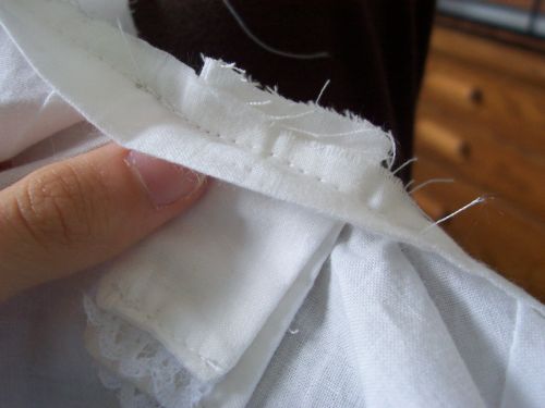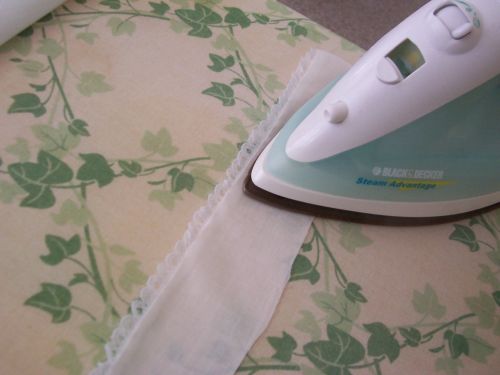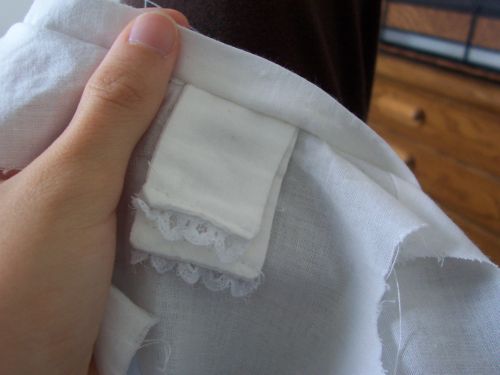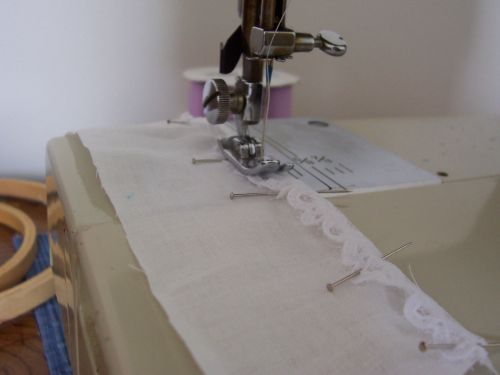 On the long edge of the long rectangles, sew the lace on so that it's pointing inward toward said rectangle.