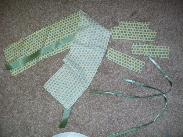 You'll notice in that photo that I also have my trim prepared (I used ribbon ironed in half out of sheer laziness, you could use bias tape if you were feeling it), and an extra green ribbon. That green ribbon is going on the skirt hem. Keep reading, you'll see.