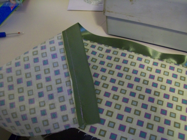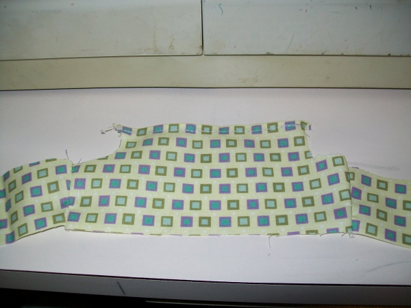 Set the bodice aside for a moment. You could hem the skirt, but in the original dress, it had an extra block of color at the hem line. I used ribbon because the texture's cool and because it was one less hem to do. If you use cloth, for God's sake, hem it first! Sew the piece to the long bottom edge of the skirt, right sides together.
