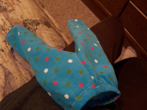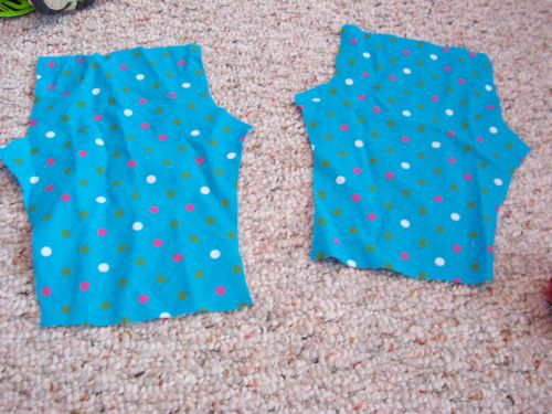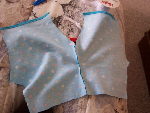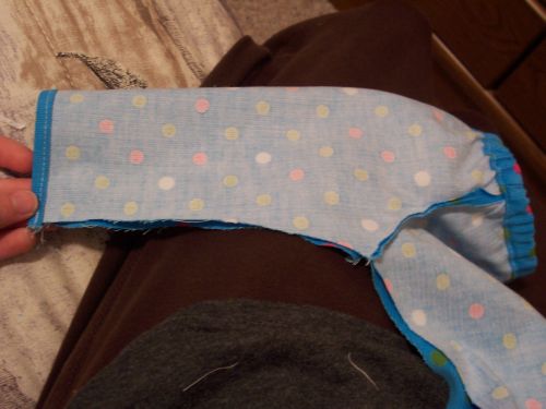 You should wind up with this. Stretch the elastic to make sure it holds -- if it pops out, take your last seam apart, dig the elastic out, and put it in again. It has to survive a stretching if it's going to stay on your doll.