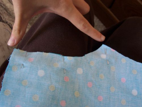 Now, place your pant halves so that the right sides are together. See where I'm pointing? We're going to sew between my fingers, from waist to inseam. Don't sew around the legs.