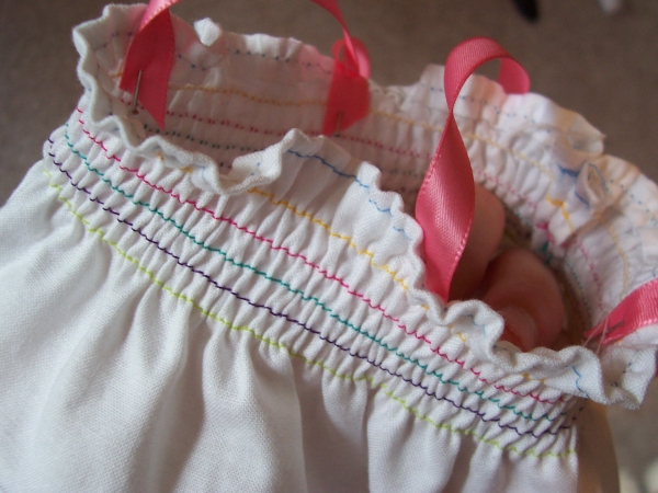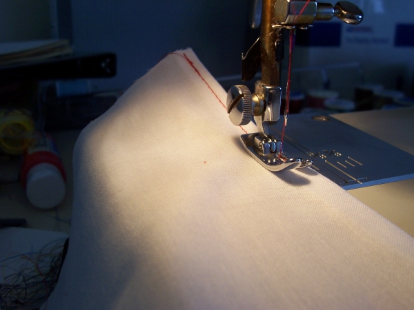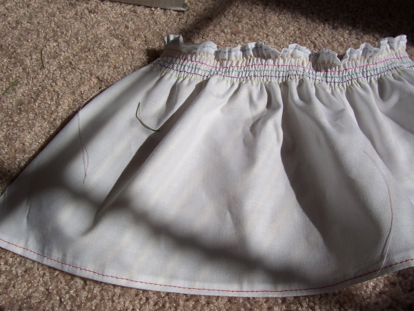 You are now ready to sew. Put in a new thread color if you like, and hem the top of your dress. You should notice the hem gathering up. Don't freak out, we want it to do that!