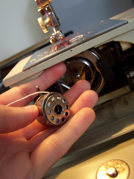 Now, fish for your bobbin like you would any normal bobbin thread. See? Pops right out.