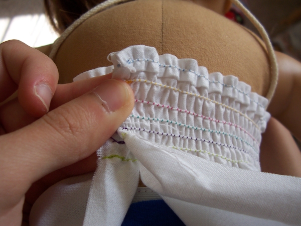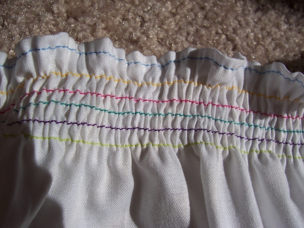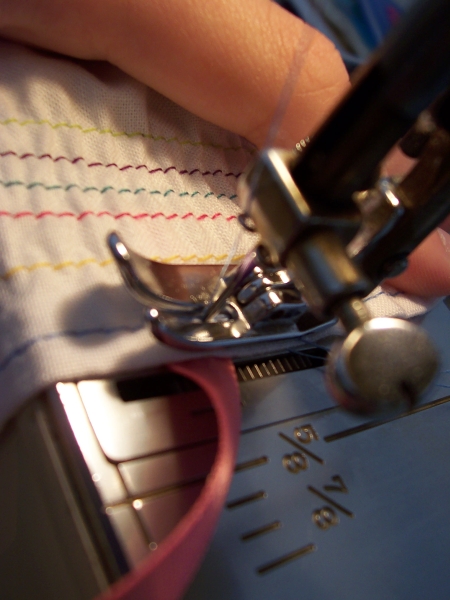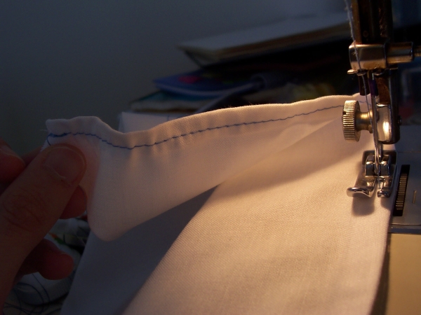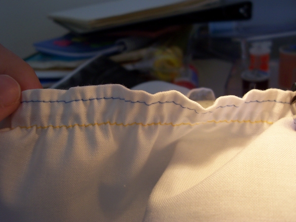 Put in a new color of thread if you want, and sew another straight line below the hem. Even though the cloth is gathering, pull it so that it's straight when it goes under the needle. You should notice it getting even more gather-ey!