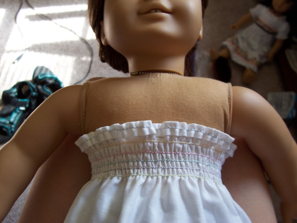 Now, go find the doll that this dress is intended for and strip them to their skivvies. Turn the dress inside out and pin it on your doll so that it fits. You may have to trim some cloth. Sara, an extra-fat PM doll, fits perfectly into her dress with no trimming.