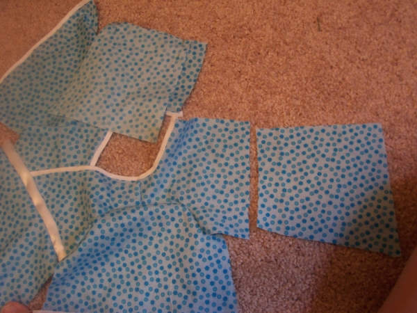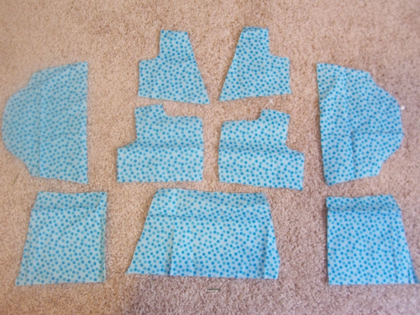 In addition, cut two backs like in the shirt tutorial, two sleeves, and the skirt bits of an a line skirt. You can finangle this to have a gathered skirt if you're slick, but we'll stick to basics for now.