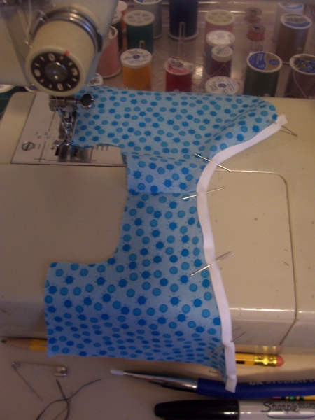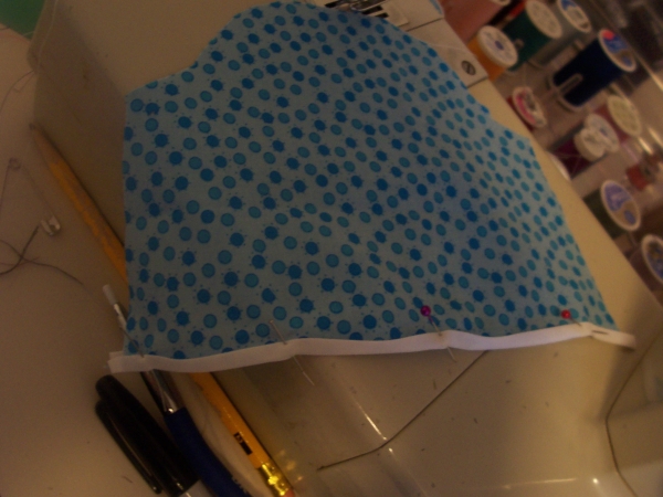 Do it to both bodice pieces. Stitch it down. Make SURE that the bodice gets trapped in the binding! If you pull your cloth and it comes undone, take your stitches out and do it again.