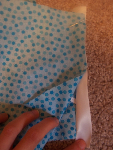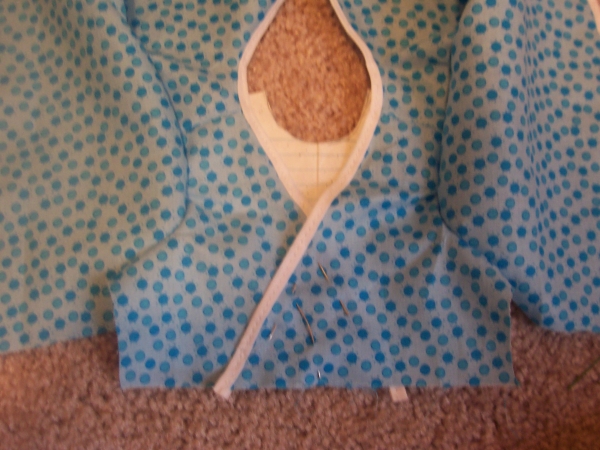 Now, get the quilt binding. Pin it along the diagonal edge, around the neck line, and right to the edge of the back.