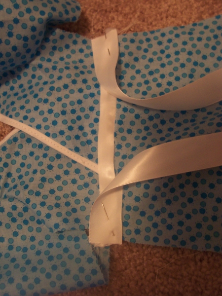 Before we go on, take two long pieces of ribbon and pin them right sides together to the ribbon waist band. Pin it so that both ribbons point inward.