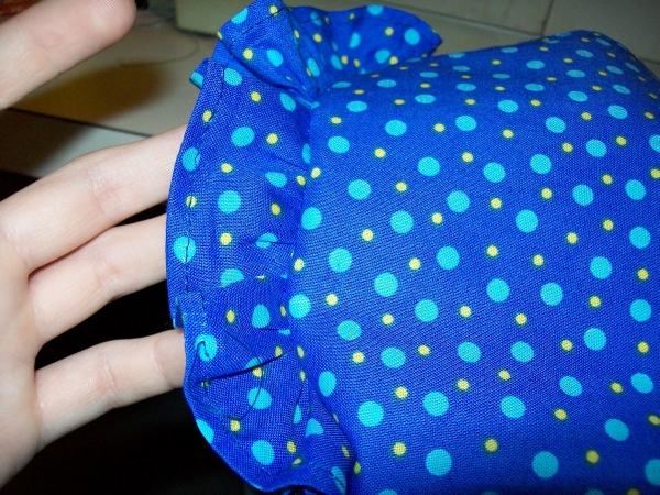 Gather the ruffle so that it's the same width as the skirt. Stitch the unfinished edge of the ruffle to an unfinished edge of the skirt, right sides together.