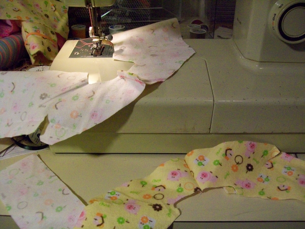 Cut the patterns, then cut your cloth. I cut out four rectangles for cuffs, too: two the width of the sleeves and about two or so inches long, and two the width of the pants about two or so inches long. Speaking of the pants, you can use their pants pattern if you really want to, but I decided that I liked my pants pattern better and just used it. It'll come out the same in the end, but I know my pants pattern works, so. (I left off the pocket and pajama ties. If you want to throw them back in, they're really easy to figure out.)