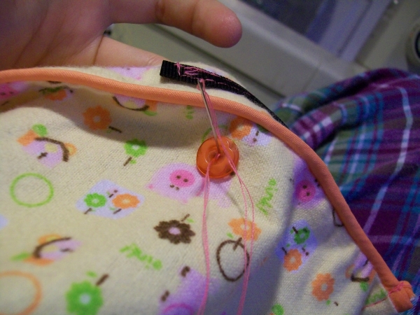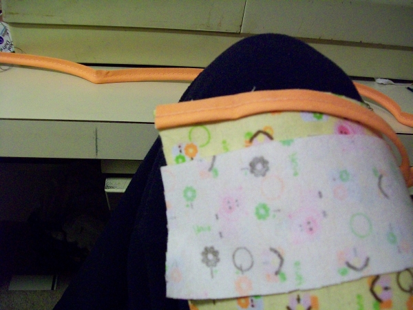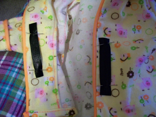 Now, Velcro. Put a piece on the outside of whatever shirt side you want to be under, then put a piece on THE INTERFACING ONLY of the shirt side you want to be over. Don't sew that last bit to the outide of the shirt! You'll have a huge rectangle stitched onto the outide of your pajamas that more or less screams "THIS PERSON DID IT WRONG."
