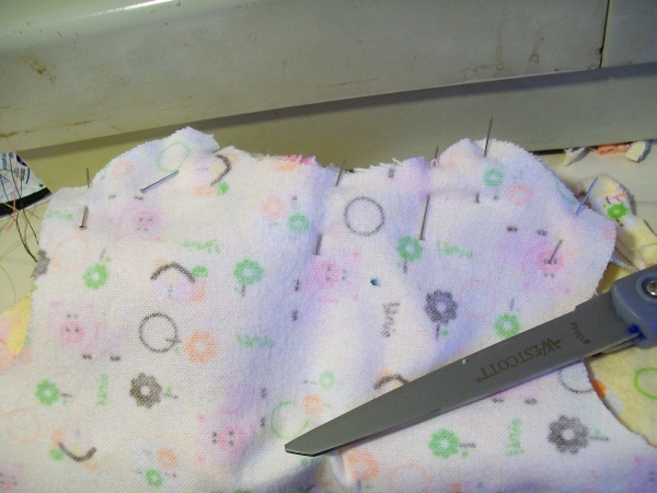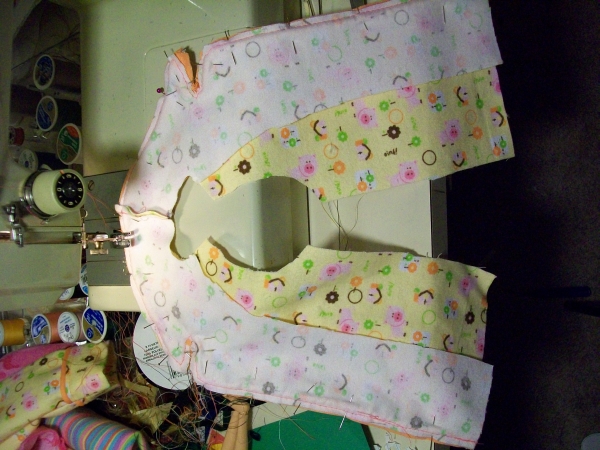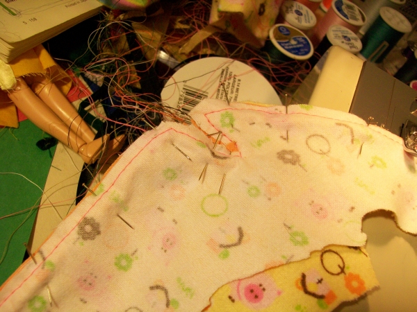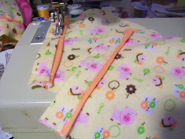More or less, to get piping onto the shirt part of the PJs, we're making a piping sandwich. Lay the outside of the PJs fac up, then lay the piping WITH THE ACTUAL ROUND BIT (THE PIPE) FACING INWARD on top of it, on the edge.