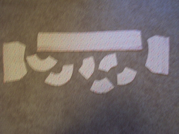 Start by cutting out your pieces: two of Hi and Hiii, then four of Hii. Also, cut a long rectangle of cloth. Consider that this is going to be the main 'skirt' of the outfit. Widthwise, it needs to be twice or three times the circumference of your doll's middle. Keep in mind that for thicker fabric, you'll use less cloth and for thinner, you'll use more cloth. Lengthwise, it needs to measure the length of your doll's chest to wherever you want it to fall (waist? knees?) plus about a half inch for the seam. Clear as mud?