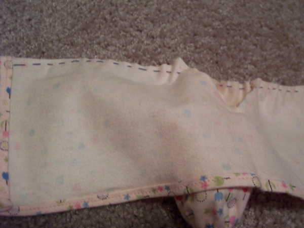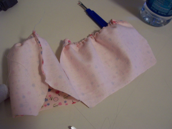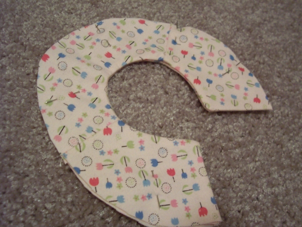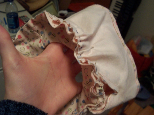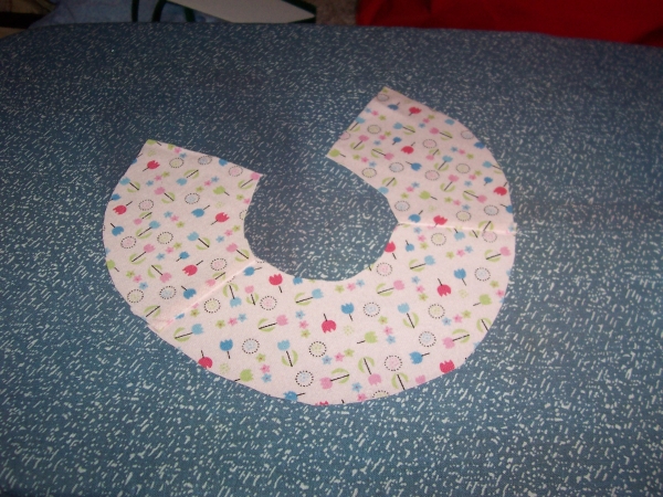 Now, pick up your big curve/horseshoe piece. See the unfinished edge? Gather your gathered piece so that it is the same length as the unfinished edge. Now, pin the gathered edge to the unfinished edge of the curve, right sides together. Stitch it down, turn and press.