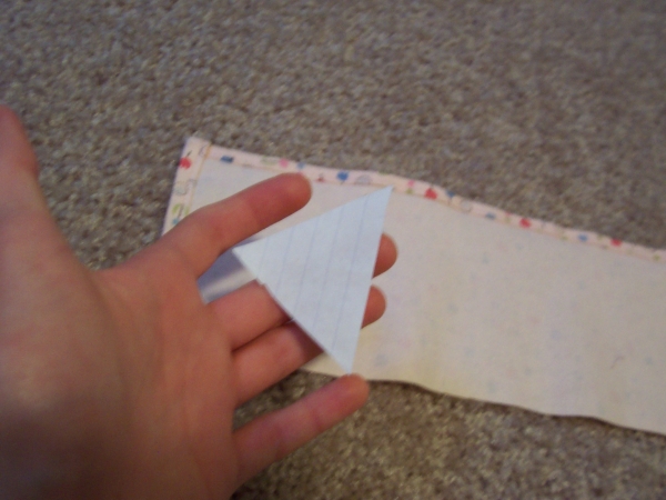 Now, get some paper. You need to draw an isosceles triangle with two of the sides equal. Speficically, go back to Hiii. Two of your triangle sides need to equal the length of the sides of Hiii that are closest (or touching the hemmed edge. You know, those edges that we left unfinished a few minutes ago. It doesn't matter what the length of the third side is, but you probably want it close to equal to the other two sides.