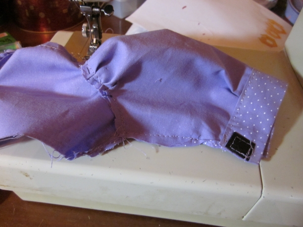 Turn the EDGE of each sleeve in twice, as if to hem it, then stitch that down. Give yourself a seam at least an inch and a half long. Gather the edge of your sleeve and insert it into one cuff. Stitch it down.