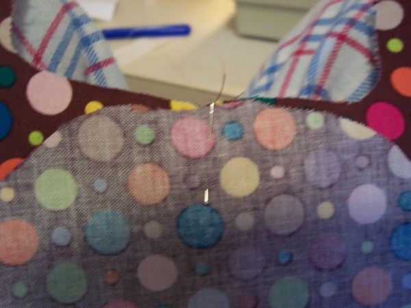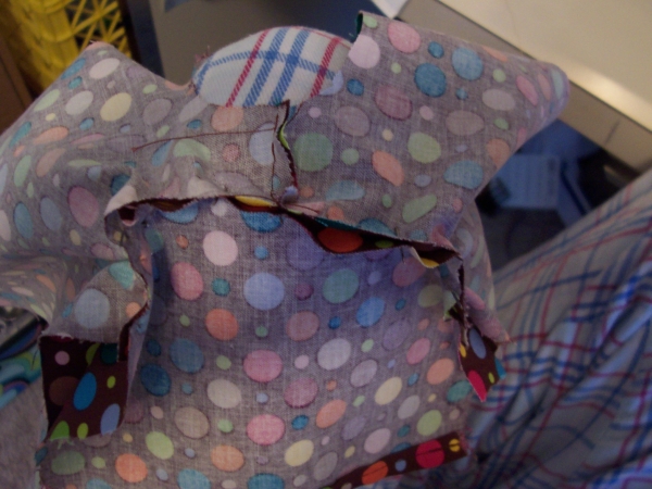 Sew along the curve. A straight stitch is fine (and seriously, your doll won't ignite if you leave an edge unfinished), but if you want, you can zig zag stitch to finish the edge a little more. If you've got a serger handy, use that. I don't own a serger. ("Bean, how do I know if I have a serger?" -- Trust me, if you've got one, you'd know about it.)
