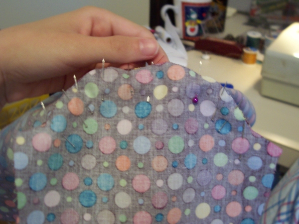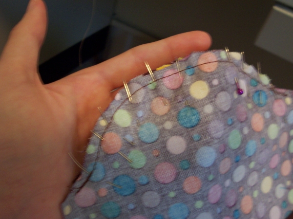 This next step in real sewing is called easing, but it really should be called "forcing". Pin the edge of the curved edge around the curve of the arm pit of the bodice. This step is aggravating, and it's going to take a few tries the first time you do it.