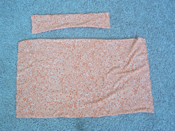 Cut two rectangles. One should be about an inch long and the exact length of your doll's waist measurement. (Remember, knit stretches.) The other rectangle should be at least 1.5 times the length of your doll's waist by TWICE as long as however long you want the skirt.