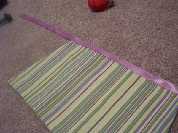 Now, find the middle of your ribbon loop. Line it up with the middle of the top edge of your skirt. Place the top edge of the skirt inbetween the two ribbon pieces.