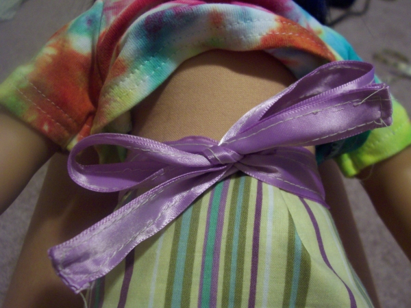 Once you've done that, you're actually done. To install your skirt, wrap it around your doll's waist and pull one end of ribbon through the button hole.
